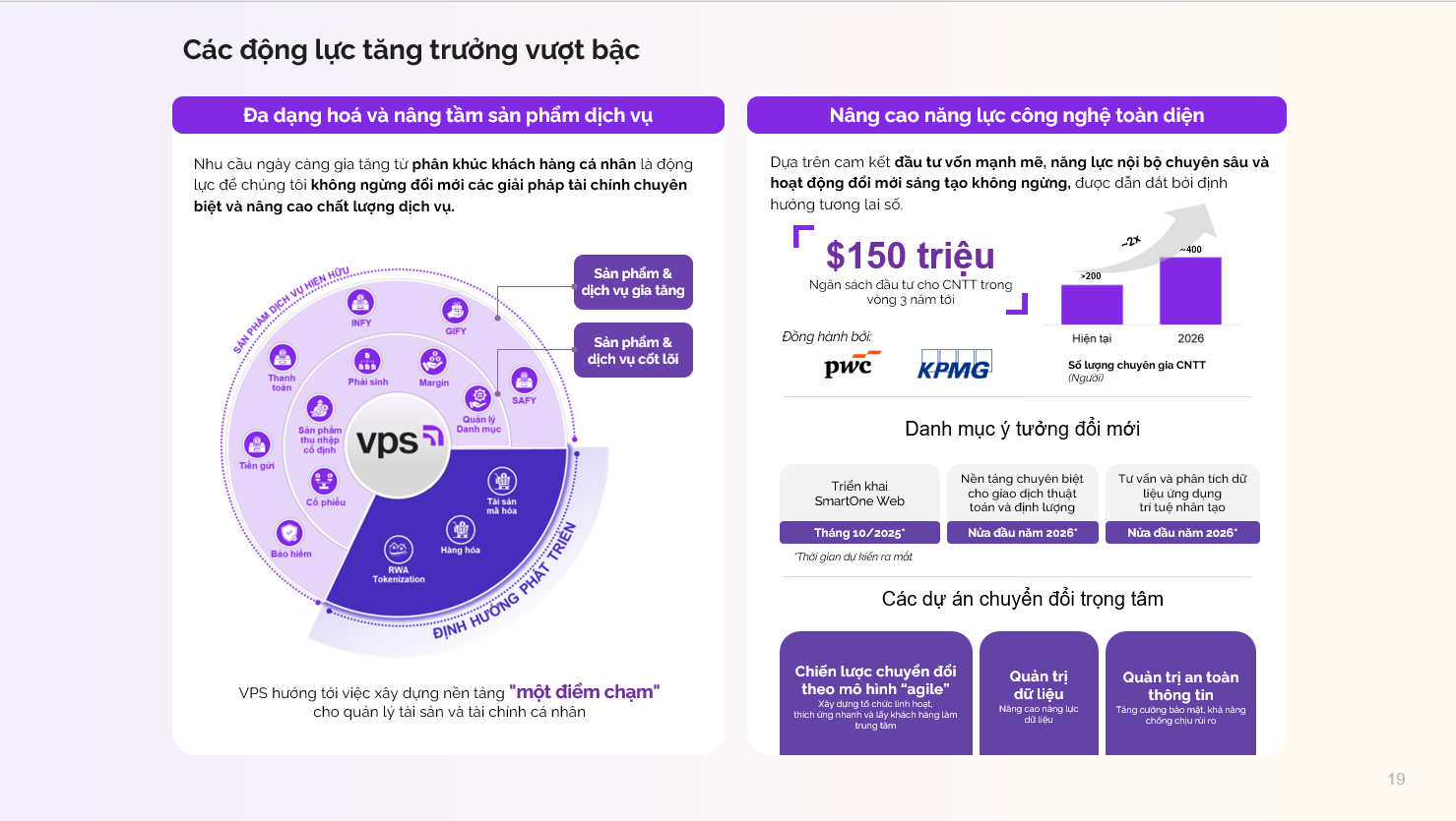 2. Là doanh nghiệp FinTech - làm chủ công nghệ 100%: Thay vì outsource như nhiều công ty đối thủ cùng ngành, VPS là công ty chứng khoán tiên phong làm chủ 100% về Công nghệ đầu tư với hơn 200 Chuyên gia CNTT, Phòng thủ An ninh mạng, 3 Trung tâm Dữ liệu và hệ thống dự phòng. Hiện tại hệ thống CNTT của VPS có năng lực công nghệ đáp ứng gấp 2 lần tiêu chuẩn về quy mô giao dịch của TTCK trong thời gian nâng hạng sắp tới. Đội ngũ Công nghệ của VPS năm 2025 đã đăng quang ngôi vị Quán Quân tại Đấu trường An toàn thông tin lớn nhất tại Việt Nam của SBC ARENA 2025.